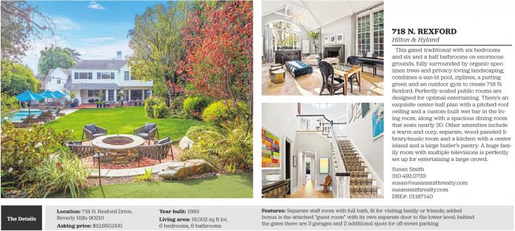 The Details Location: 718 N. Rexford Drive, Beverly Hills 90210 Asking price: $12,650,000 Year built: 1993 Living area: 18,002 sq ft lot, 6 bedrooms, 6 bathrooms 718 N. REXFORD Hilton & Hyland This gated traditional with six bedrooms and six and a half bathrooms on enormous grounds, fully surrounded by organic specimen trees and privacy-loving landscaping, combines a sun-lit pool, ziplines, a putting green and an outdoor gym to create 718 N. Rexford. Perfectly scaled public rooms are designed for optimal entertaining. There’s an exquisite center-hall plan with a pitched-roof ceiling and a custom-built wet bar in the living room, along with a spacious dining room that seats nearly 20. Other amenities include a warm and cozy, separate, wood-paneled library/music room and a kitchen with a center island and a large butler’s pantry. A huge family room with multiple televisions is perfectly set up for entertaining a large crowd. Susan Smith 310.492.0733 susan@susansmithrealty.com susansmithrealty.com DRE#: 01187140 Features: Separate staff room with full bath, fit for visiting family or friends; added bonus is the attached “guest room” with its own separate door to the lower level; behind the gates there are 3 garages and 2 additional spots for off-street parking See also