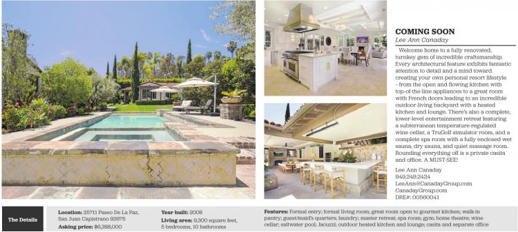 The Details Location: 25711 Paseo De La Paz, San Juan Capistrano 92675 Asking price: $6,388,000 Year built: 2008 Living area: 9,300 square feet, 5 bedrooms, 10 bathrooms COMING SOON Lee Ann Canaday Welcome home to a fully renovated, turnkey gem of incredible craftsmanship. Every architectural feature exhibits fantastic attention to detail and a mind toward creating your own personal resort lifestyle – from the open and flowing kitchen with top-of-the-line appliances to a great room with French doors leading to an incredible outdoor-living backyard with a heated kitchen and lounge. There’s also a complete, lower-level entertainment retreat featuring a subterranean temperature-regulated wine cellar, a TruGolf simulator room, and a complete spa room with a fully enclosed wet sauna, dry sauna, and quiet massage room. Rounding everything off is a private casita and office. A MUST-SEE! Lee Ann Canaday 949.249.2424 LeeAnn@CanadayGroup.com CanadayGroup.com DRE#: 00560041 Features: Formal entry; formal living room; great room open to gourmet kitchen; walk-in pantry; guest/maid’s quarters; laundry; master retreat; spa room; gym; home theatre; wine cellar; saltwater pool; Jacuzzi; outdoor heated kitchen and lounge; casita and separate office See also