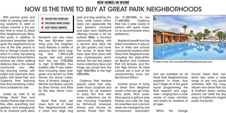 With premier parks and miles of winding trails inviting residents to relish in nature, summer is the perfect time to move to Great Park Neighborhoods.Beautiful pools, in addition to abundant amenities distinguish the neighborhood as one of the best places to live in Orange County.And when it is time, top-ranking Irvine Unified School District schools are within walking distance.Rise is the newest community now offering stunning homes with bright and expansive floorplans, with Novel Park and Cadence Park featuring their final remaining collections available for sale.