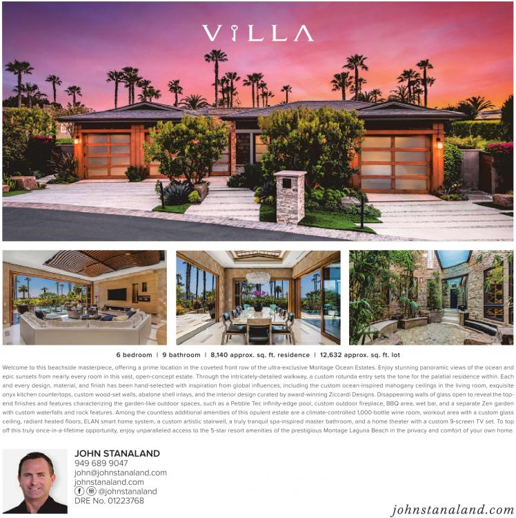 6 bedroom | 9 bathroom | 8,140 approx. sq. ft. residence | 12,632 approx. sq. ft. lot Welcome to this beachside masterpiece, offering a prime location in the coveted front row of the ultra-exclusive Montage Ocean Estates. Enjoy stunning panoramic views of the ocean and epic sunsets from nearly every room in this vast, open-concept estate. Through the intricately-detailed walkway, a custom rotunda entry sets the tone for the palatial residence within. Each and every design, material, and finish has been hand-selected with inspiration from global influences, including the custom ocean-inspired mahogany ceilings in the living room, exquisite onyx kitchen countertops, custom wood-set walls, abalone shell inlays, and the interior design curated by award-winning Ziccardi Designs. Disappearing walls of glass open to reveal the topend finishes and features characterizing the garden-like outdoor spaces, such as a Pebble Tec infinity-edge pool, custom outdoor fireplace, BBQ area, wet bar, and a separate Zen garden with custom waterfalls and rock features. Among the countless additional amenities of this opulent estate are a climate-controlled 1,000-bottle wine room, workout area with a custom glass ceiling, radiant heated floors, ELAN smart home system, a custom artistic stairwell, a truly tranquil spa-inspired master bathroom, and a home theater with a custom 9-screen TV set. To top off this truly once-in-a-lifetime opportunity, enjoy unparalleled access to the 5-star resort amenities of the prestigious Montage Laguna Beach in the privacy and comfort of your own home. JOHN STANALAND 949 689 9047 john@johnstanaland.com johnstanaland.com @johnstanaland DRE No. 01223768 johnstanaland.com