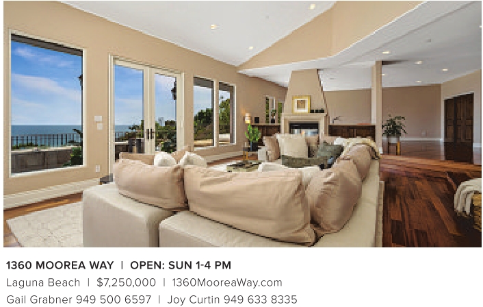1360 MOOREA WAY | OPEN: SUN 1-4 PM Laguna Beach | $7,250,000 | 1360MooreaWay.com Gail Grabner 949 500 6597 | Joy Curtin 949 633 8335
