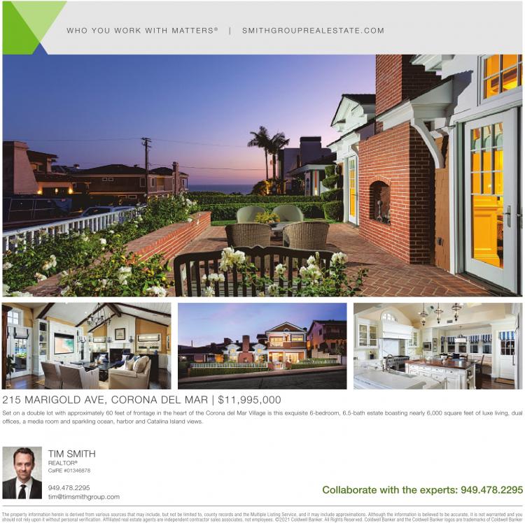 WHO YOU WORK WITH MATTERS ® | SMITHGROUPREALESTATE.COM 215 MARIGOLD AVE, CORONA DEL MAR | $11,995,000 Set on a double lot with approximately 60 feet of frontage in the heart of the Corona del Mar Village is this exquisite 6-bedroom, 6.5-bath estate boasting nearly 6,000 square feet of luxe living, dual offices, a media room and sparkling ocean, harbor and Catalina Island views. TIM SMITH REALTOR ® CalRE #01346878 949.478.2295 tim@timsmithgroup.com Collaborate with the experts: 949.478.2295 The property information herein is derived from various sources that may include, but not be limited to, county records and the Multiple Listing Service, and it may include approximations. Although the information is believed to be accurate, it is not warranted and you should notrelyuponitwithout personal verification.Affiliated real estate agentsare independent contractor sales associates, notemployees. ©2021 ColdwellBanker. AllRights Reserved.ColdwellBanker andthe ColdwellBanker logosare trademarksofColdwell Banker