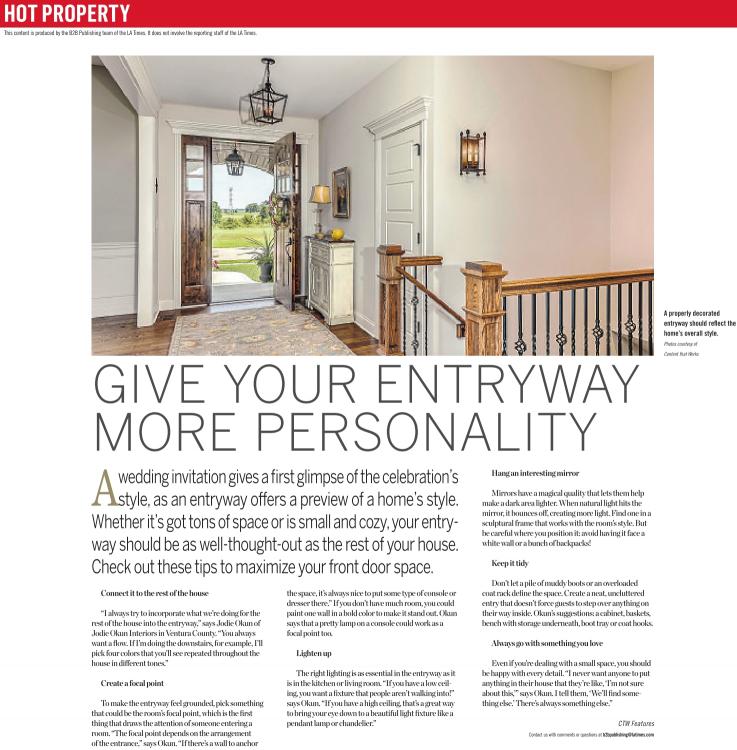 “I always trytoincorporate what we’redoing forthe rest of the houseinto the entryway,” says Jodie Okun of Jodie Okun Interiors in VenturaCounty.“Youalways want aflow.IfI’m doing the downstairs,for example, I’ll pick four colors that you’ll seerepeated throughout the houseindifferent tones.”