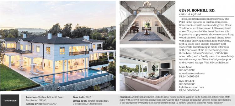 The Details Location: 624 North Bonhill Road, Brentwood 90049 Asking price: $32,500,000 Year built: 2015 Living area: 19,285 square feet, 9 bedrooms, 14 bathrooms 624 N. BONHILL RD. Hilton & Hyland Profound prominence in Brentwood, The Point is the epitome of custom immoderation combined with commanding East Coast Traditional architecture on 1.89 exceptional acres. Composed of the finest finishes, this impressive trophy estate showcases a striking wood-paneled library, a formal dining room with a full catering kitchen, nine bedrooms, and 14 baths with custom masonry and stonework. Entertaining is made effortless with your state-of-the-art screening room, three bars, full chef’s kitchen, 1000-bottle wine cellar, and a family room that seamlessly transitions to your 69-foot infinity-edge pool and covered lounge. Visit 624bonhill.com Marc Noah 310.968.9212 marc@marcnoah.com DRE#: 01269495 Kyle Dordick 310.508.0966 kyle@marcnoah.com DRE#: 02039649 Features: Additional amenities include: pool house cabana with en-suite bedroom; 2-bedroom staff suite with its own kitchen, lounge and entry; gym and wellness space; full Creston home automation; 3-car garage for everyday use; car museum fitting 12 luxury vehicles; billiards room; elevator See also