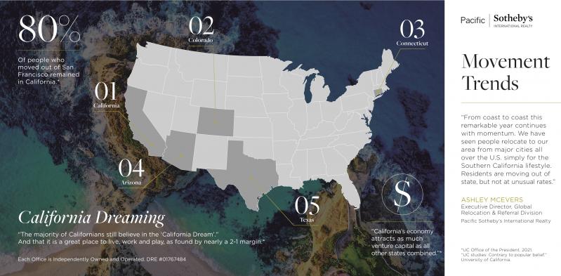 80% 02 Colorado Of people who moved out of San Francisco remained in California.* 01 California 04 Arizona California Dreaming “The majority of Californians still believe in the ‘California Dream’.” And that it is a great place to live, work and play, as found by nearly a 2-1 margin.* Each Office is Independently Owned and Operated. DRE #01767484 05 Texas 03 Connecticut $ “California’s economy attracts as much venture capital as all other states combined.”* Movement Trends “From coast to coast this remarkable year continues with momentum. We have seen people relocate to our area from major cities all over the U.S. simply for the Southern California lifestyle. Residents are moving out of state, but not at unusual rates.” ASHLEY MCEVERS Executive Director, Global Relocation & Referral Division Pacific Sotheby’s International Realty *UC Office of the President. 2021. “UC studies: Contrary to popular belief.” University of California.
