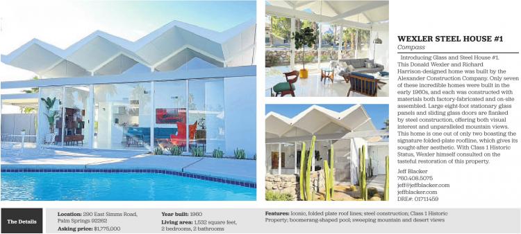 The Details Location: 290 East Simms Road, Palm Springs 92262 Asking price: $1,775,000 Year built: 1960 Living area: 1,532 square feet, 2 bedrooms, 2 bathrooms WEXLER STEEL HOUSE #1 Compass Introducing Glass and Steel House #1. This Donald Wexler and Richard Harrison-designed home was built by the Alexander Construction Company. Only seven of these incredible homes were built in the early 1960s, and each was constructed with materials both factory-fabricated and on-site assembled. Large eight-foot stationary glass panels and sliding glass doors are flanked by steel construction, offering both visual interest and unparalleled mountain views. This home is one out of only two boasting the signature folded-plate roofline, which gives its sought-after aesthetic. With Class 1 Historic Status, Wexler himself consulted on the tasteful restoration of this property. Jeff Blacker 760.408.5075 jeff@jeffblacker.com jeffblacker.com DRE#: 01711459 Features: Iconic, folded plate roof lines; steel construction; Class 1 Historic Property; boomerang-shaped pool; sweeping mountain and desert views See also