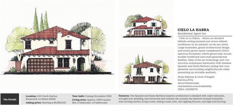 The Details Location: 1101 North Harbor Boulevard, La Habra 90631 Asking price: Starting at $1,695,000 Year built: Coming November 2021 Living area: Approx. 3,650 square feet, 5 bedrooms, 4.5 bathrooms CIELO LA HABRA Residential Agent Inc. Cielo in La Habra — where an elevated hillside setting presents just seven refined residences on an intimate cul-de-sac street. Large homesites, grand architectural design and scenic green space complement Cielo’s spacious floorplans, which generously accommodate traditional and multi-generational families. State-of-the-art technology and construction techniques harmonize with timeless Spanish and Santa Barbara styling that complements surrounding neighborhoods while presenting an enviable aesthetic. Hoda Hajirnia & Drew D’Angelo 949.244.6754 drew@thehd.team cielolahabra.com/availability DRE#: 02068079 Features: The Spanish and Santa Barbara-inspired architecture is detailed with Juliet balconies, wrought-iron detailing, and terracotta and ceramic tile accents; the interiors include homesites with inviting entries, living rooms, dining rooms, lofts, chic lighting fixtures, and high-end flooring See also