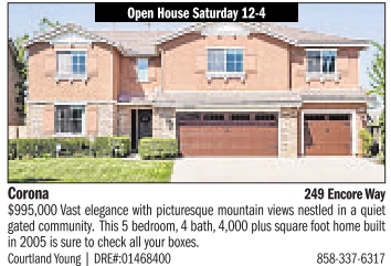 Open House Saturday 12-4 Corona 249 Encore Way $995,000 Vast elegance with picturesque mountain views nestled in a quiet gated community. This 5 bedroom, 4 bath, 4,000 plus square foot home built in 2005 is sure to check all your boxes. Courtland Young | DRE#:01468400 858-337-6317