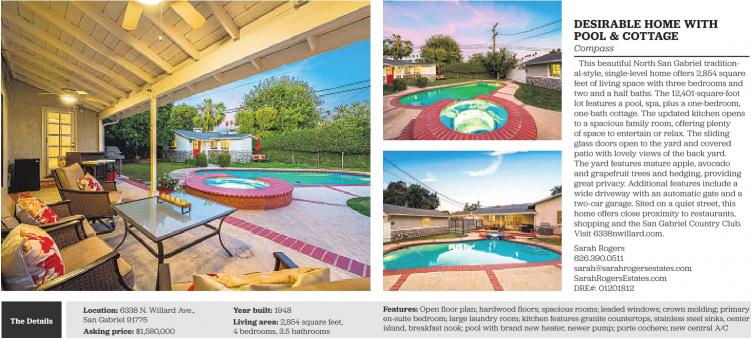 The Details Location: 6338 N. Willard Ave., San Gabriel 91775 Asking price: $1,580,000 Year built: 1948 Living area: 2,854 square feet, 4 bedrooms, 3.5 bathrooms DESIRABLE HOME WITH POOL & COTTAGE Compass This beautiful North San Gabriel traditional-style, single-level home offers 2,854 square feet of living space with three bedrooms and two and a half baths. The 12,401-square-foot lot features a pool, spa, plus a one-bedroom, one-bath cottage. The updated kitchen opens to a spacious family room, offering plenty of space to entertain or relax. The sliding glass doors open to the yard and covered patio with lovely views of the back yard. The yard features mature apple, avocado and grapefruit trees and hedging, providing great privacy. Additional features include a wide driveway with an automatic gate and a two-car garage. Sited on a quiet street, this home offers close proximity to restaurants, shopping and the San Gabriel Country Club. Visit 6338nwillard.com. Sarah Rogers 626.390.0511 sarah@sarahrogersestates.com SarahRogersEstates.com DRE#: 01201812 Features: Open floor plan; hardwood floors; spacious rooms; leaded windows; crown molding; primary en-suite bedroom; large laundry room; kitchen features granite countertops, stainless steel sinks, center island, breakfast nook; pool with brand new heater, newer pump; porte cochere; new central A/C See also