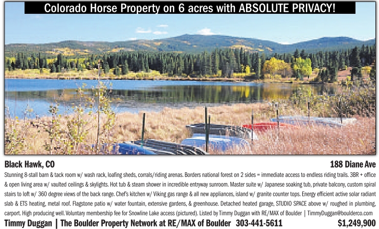 carport. High producing well.Voluntarymembershipfee for Snowline Lake access(pictured). Listed by Timmy Duggan withRE/MAX of Boulder |TimmyDuggan@boulderco.com TimmyDuggan |The Boulder PropertyNetwork at RE/MAXofBoulder 303-441-5611 $1,249,900