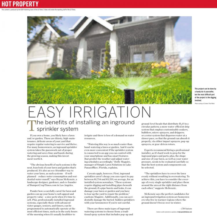 “The obvious benefit of such systems is the neat, lean look of your lawn and garden that’s produced. It’salsoaneco-friendlier wayto water your lawn, as such systems –ifwellplanned –reducewater consumption and residential water runoff,”saysBryan McKenzie, a landscape designer,gardener,and co-founder of BumperCropTimes.com in Los Angeles.