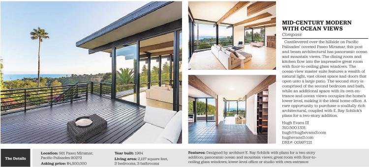 The Details Location: 561 Paseo Miramar, Pacific Palisades 90272 Asking price: $4,500,000 Year built: 1964 Living area: 2,127 square feet, 2 bedrooms, 3 bathrooms MID-CENTURY MODERN WITH OCEAN VIEWS Compass Cantilevered over the hillside on Pacific Palisades’ coveted Paseo Miramar, this post and beam architectural has panoramic ocean and mountain views. The dining room and kitchen flow into the impressive great room with floor-to-ceiling glass windows. The ocean-view master suite features a wealth of natural light, vast closet space and doors that open unto a large patio. The second story is comprised of the second bedroom and bath, while an additional space with its own entrance and ocean views occupies the home’s lower level, making it the ideal home office. A rare opportunity to purchase a soulfully rich architectural, coupled with E. Ray Schlick’s plans for a two-story addition. Hugh Evans III 310.500.1331 hugh@hughevans3.com hughevans3.com DRE#: 00997121 Features: Designed by architect E. Ray Schlick with plans for a two-story addition; panoramic ocean and mountain views; great room with floor-toceiling glass windows; lower-level office or studio with own entrance See also