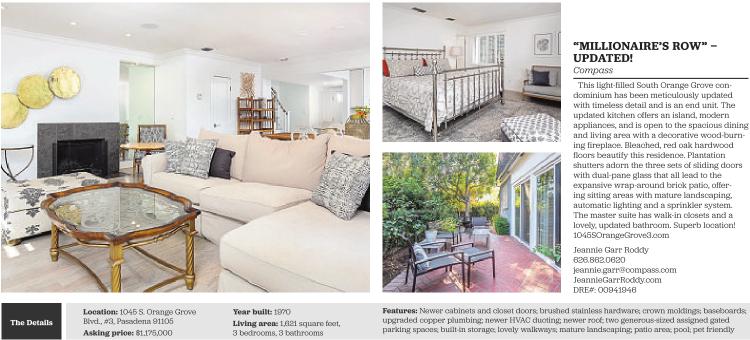 The Details Location: 1045 S. Orange Grove Blvd., #3, Pasadena 91105 Asking price: $1,175,000 Year built: 1970 Living area: 1,621 square feet, 3 bedrooms, 3 bathrooms “MILLIONAIRE’S ROW” – UPDATED! Compass This light-filled South Orange Grove condominium has been meticulously updated with timeless detail and is an end unit. The updated kitchen offers an island, modern appliances, and is open to the spacious dining and living area with a decorative wood-burning fireplace. Bleached, red oak hardwood floors beautify this residence. Plantation shutters adorn the three sets of sliding doors with dual-pane glass that all lead to the expansive wrap-around brick patio, offering sitting areas with mature landscaping, automatic lighting and a sprinkler system. The master suite has walk-in closets and a lovely, updated bathroom. Superb location! 1045SOrangeGrove3.com Jeannie Garr Roddy 626.862.0620 jeannie.garr@compass.com JeannieGarrRoddy.com DRE#: 00941946 Features: Newer cabinets and closet doors; brushed stainless hardware; crown moldings; baseboards; upgraded copper plumbing; newer HVAC ducting; newer roof; two generous-sized assigned gated parking spaces; built-in storage; lovely walkways; mature landscaping; patio area; pool; pet friendly See also