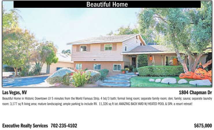 Beautiful Home Las Vegas, NV 1804 ChapmanDr BeautifulHomeinHistoricDowntown LV 5minutesfromthe World Famous Strip. 4bd/3bath; formalliving room;separate familyroom; den;family; sauna; separatelaundry room: 3,177sqftliving area; mature landscaping;ample parking to include RV. 11,326 sq ft lot: AMAZING BACK YARD W/HEATED POOL &SPA:aresortretreat! Executive Realty Services 702-235-4102 $675,000