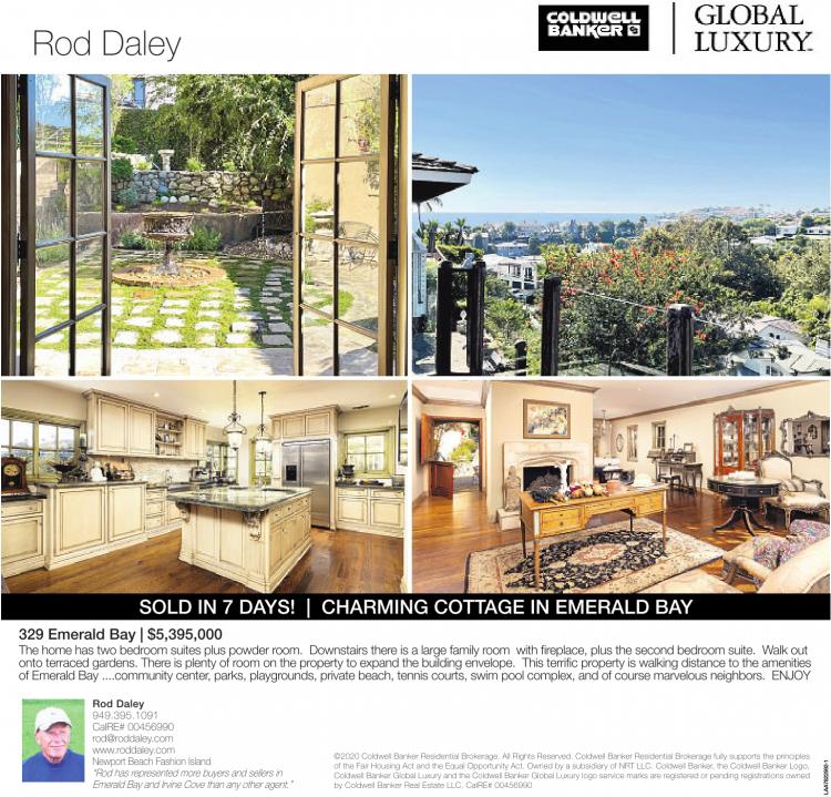 Rod Daley SOLD IN 7 DAYS! | CHARMING COTTAGE IN EMERALD BAY 329 Emerald Bay | $5,395,000 The home has two bedroom suites plus powder room. Downstairs there is a large family room with fireplace, plus the second bedroom suite. Walk out onto terraced gardens. There is plenty of room on the property to expand the building envelope. This terrific property is walking distance to the amenities of Emerald Bay ....community center, parks, playgrounds, private beach, tennis courts, swim pool complex, and of course marvelous neighbors. ENJOY Rod Daley 949.395.1091 CalRE# 00456990 rod@roddaley.com www.roddaley.com Newport Beach Fashion Island “Rod has represented more buyers and sellers in Emerald Bay and Irvine Cove than any other agent.” ©2020 Coldwell Banker Residential Brokerage. All Rights Reserved. Coldwell Banker Residential Brokerage fully supports the principles of the Fair Housing Act and the Equal Opportunity Act. Owned by a subsidiary of NRT LLC. Coldwell Banker, the Coldwell Banker Logo, Coldwell Banker Global Luxury and the Coldwell Banker Global Luxury logo service marks are registered or pending registrations owned by Coldwell Banker Real Estate LLC. CalRE# 00456990