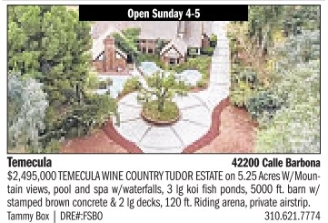 Open Sunday 4-5 Temecula 42200 Calle Barbona $2,495,000 TEMECULA WINE COUNTRY TUDOR ESTATE on 5.25 Acres W/Mountain views, pool and spa w/waterfalls, 3 lg koi fish ponds, 5000 ft. barn w/ stamped brown concrete & 2 lg decks, 120 ft. Riding arena, private airstrip. Tammy Box | DRE#:FSBO 310.621.7774