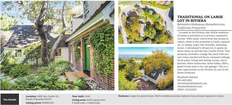 Located in the Riviera, this 1940s traditional home is perched on a private, expansive corner. With many views from this prime location, there is the potential to build, expand on, or simply enjoy this friendly, charming home. A developer’s dream lot, it opens on three sides on private San Onofre Drive. This property includes: a large flat yard with mature trees, hardwood floors, beamed ceilings, brick patio, living and dining rooms, eat-in kitchen, three bedrooms, three baths, office, guest house and a two-car garage. This is a rare opportunity in the Riviera in one of the finest locations.