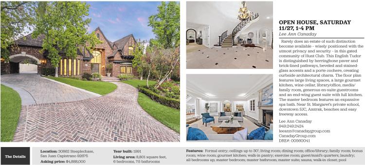 The Details Location: 30862 Steeplechase, San Juan Capistrano 92675 Asking price: $4,888,000 Year built: 1991 Living area: 8,801 square feet, 6 bedrooms, 7.5 bathrooms OPEN HOUSE, SATURDAY 11/27, 1-4 PM Lee Ann Canaday Rarely does an estate of such distinction become available – wisely positioned with the utmost privacy and security – in this gated community of Hunt Club. This English Tudor is distinguished by herringbone paver and brick-lined pathways, beveled and stainedglass accents and a porte cochere, creating curbside architectural charm. The floor plan features large living spaces, a large gourmet kitchen, wine cellar, library/office, media/ family room, generous en-suite guestrooms and an end-wing guest suite with full kitchen. The master bedroom features an expansive spa bath. Near St. Margaret’s private school, downtown SJC, Amtrak, beaches and easy freeway access. Lee Ann Canaday 949.249.2424 leeann@canadaygroup.com CanadayGroup.com DRE#: 00560041 Features: Formal entry; ceilings up to 30’; living room; dining room; office/library; family room; bonus room; wine room; gourmet kitchen; walk-in pantry; exercise room; guest/maid’s quarters; laundry; all bedrooms up; master bedroom; master bathroom; master suite; sauna; walk-in closet; pool See also