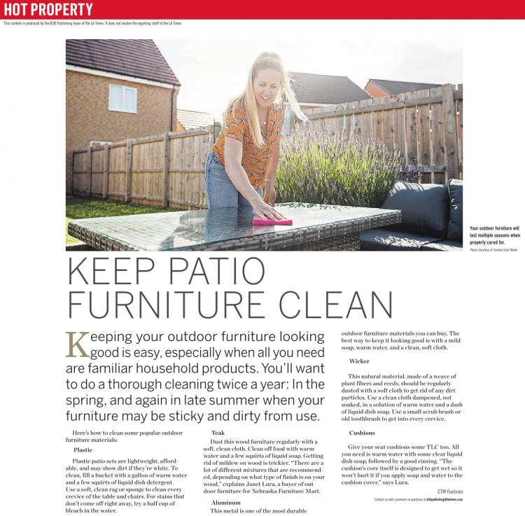Dustthis wood furnitureregularlywith a soft, clean cloth. Clean off food with warm water and afew squirts of liquid soap.Getting rid of mildewonwood is trickier.“Thereare a lotofdifferent mixtures that arerecommended, depending on what type of finish is on your wood,”explains JanetLura, abuyer of outdoor furniturefor Nebraska FurnitureMart.