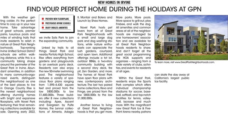 With the weather getting colder, it’s the perfect time to cozy up in your new home. Take advantage of great schools, premier parks, luxurious pools and miles of winding trails that invite residents to relish in nature at Great Park Neighborhoods. Top-ranking Irvine Unified School District schools are within walking distance, while this is a community taking shape around the perimeter of the Great Park in Irvine. Abundant amenities, in addition to many community-organized events, distinguish the neighborhood as one of the best places to live in Orange County. Rise is the newest neighborhood offering stunning homes with bright and expansive floorplans, with Novel Park featuring their final remaining collections available for sale. Opening early 2022,