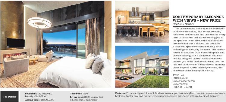 The Details Location: 9152 Janice Pl., Beverly Hills 90210 Asking price: $18,900,000 Year built: 1966 Living area: 8,520 square feet, 5 bedrooms, 7 bathrooms CONTEMPORARY ELEGANCE WITH VIEWS – NEW PRICE Coldwell Banker This private estate is the ultimate for indoor/ outdoor entertaining. The former celebrity residence exudes class and grandeur at every turn, with soaring ceilings welcoming you to the spacious living area with a double-sided fireplace and chef’s kitchen that provides a balanced space to entertain during large gatherings or everyday moments. The master retreat is complete with a brass fireplace and private balcony, plus a glam room and masterfully designed closets. Walls of windows beckon you to the outdoor saltwater pool, hot tub, and outdoor chef’s area—all with stunning views beyond. A true celebrity enclave, this gem exemplifies Beverly Hills living! Joyce Rey 310.285.7529 joyce@joycerey.com joycerey.com DRE#: 00465013 Features: Private and gated; incredible views from canyon to ocean; glam room and expansive closets; heated saltwater pool and hot tub; spacious open concept living area with double-sided fireplace See also