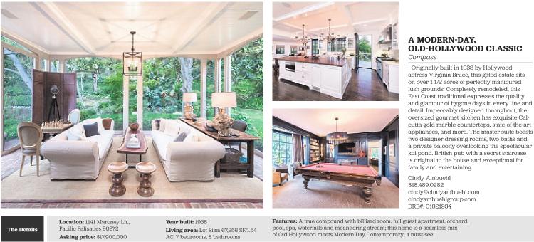 The Details Location: 1141 Maroney Ln., Pacific Palisades 90272 Asking price: $17,900,000 Year built: 1938 Living area: Lot Size: 67,256 SF/1.54 AC, 7 bedrooms, 8 bathrooms A MODERN-DAY, OLD-HOLLYWOOD CLASSIC Compass Originally built in 1938 by Hollywood actress Virginia Bruce, this gated estate sits on over 1 1/2 acres of perfectly manicured lush grounds. Completely remodeled, this East Coast traditional expresses the quality and glamour of bygone days in every line and detail. Impeccably designed throughout, the oversized gourmet kitchen has exquisite Calcutta gold marble countertops, state-of-the-art appliances, and more. The master suite boasts two designer dressing rooms, two baths and a private balcony overlooking the spectacular koi pond. British pub with a secret staircase is original to the house and exceptional for family and entertaining. Cindy Ambuehl 818.489.0282 cindy@cindyambuehl.com cindyambuehlgroup.com DRE#: 01821934 Features: A true compound with billiard room, full guest apartment, orchard, pool, spa, waterfalls and meandering stream; this home is a seamless mix of Old Hollywood meets Modern Day Contemporary; a must-see! See also