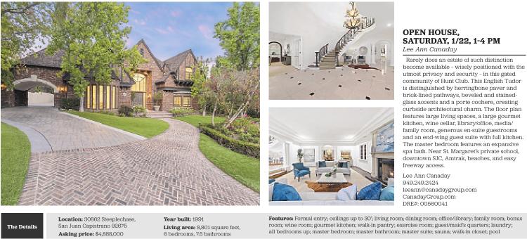 The Details Location: 30862 Steeplechase, San Juan Capistrano 92675 Asking price: $4,888,000 Year built: 1991 Living area: 8,801 square feet, 6 bedrooms, 7.5 bathrooms OPEN HOUSE, SATURDAY, 1/22, 1-4 PM Lee Ann Canaday Rarely does an estate of such distinction become available – wisely positioned with the utmost privacy and security – in this gated community of Hunt Club. This English Tudor is distinguished by herringbone paver and brick-lined pathways, beveled and stainedglass accents and a porte cochere, creating curbside architectural charm. The floor plan features large living spaces, a large gourmet kitchen, wine cellar, library/office, media/ family room, generous en-suite guestrooms and an end-wing guest suite with full kitchen. The master bedroom features an expansive spa bath. Near St. Margaret’s private school, downtown SJC, Amtrak, beaches, and easy freeway access. Lee Ann Canaday 949.249.2424 leeann@canadaygroup.com CanadayGroup.com DRE#: 00560041 Features: Formal entry; ceilings up to 30’; living room; dining room; office/library; family room; bonus room; wine room; gourmet kitchen; walk-in pantry; exercise room; guest/maid’s quarters; laundry; all bedrooms up; master bedroom; master bathroom; master suite; sauna; walk-in closet; pool See also
