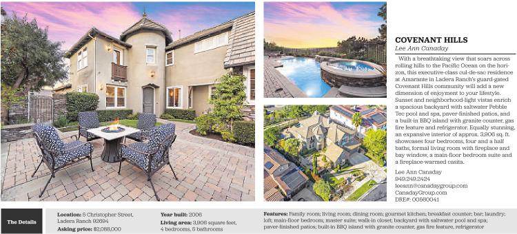 With a breathtaking view that soars across rolling hills to the Pacific Ocean on the horizon, this executive-class cul-de-sac residence at Amarante in Ladera Ranch’s guard-gated Covenant Hills community will add a new dimension of enjoyment to your lifestyle. Sunset and neighborhood-light vistas enrich a spacious backyard with saltwater Pebble Tec pool and spa, paver-finished patios, and a built-in BBQ island with granite counter, gas fire feature and refrigerator. Equally stunning, an expansive interior of approx. 3,906 sq. ft. showcases four bedrooms, four and a half baths, formal living room with fireplace and bay window, a main-floor bedroom suite and a fireplace-warmed casita.