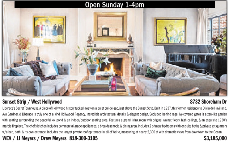 Open Sunday 1-4pm SunsetStrip /West Hollywood 8732 Shoreham Dr Liberace’s SecretTownhouse.Apiece of Hollywoodhistory tucked away on aquiet cul-de-sac,just above the Sunset Strip.Built in 1937,thisformerresidence to Olivia de Havilland, Ava Gardner,&Liberaceistrulyone of akindHollywood Regency.Incredible architecturaldetails&elegantdesign. Secluded behind regal ivy-coveredgates is azen-likegarden with seating surroundingthe peaceful koi pond &anindoor/outdoor seating area. Features agrand living roomwith original walnut floors,highceilings, &anexquisite 1930’s marble fireplace.The chef’skitchen includescommercial-grade appliances,abreakfast nook,&dining area.Includes 2primary bedrooms withensuite baths&private gst quarters w/a bed, bath, &its own entrance.Includes the largestprivate rooftopterraceinall of WeHo, measuringatnearly2,300 sf with dramaticviews fromdowntown to theOcean. WEA /JJMeyers /DrewMeyers 818-300-3105 $3,185,000