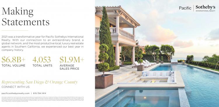 Ma ki n g S t ate m e n t s 2021 was a transformative year for Pacific Sothebys International Realty. With our connection to an extraordinary brand, a global network, and the most productive local, luxury real estate agents in Southern California, we experienced our best year in company history. $6.8B+ TOTAL VOLUME 4,053 TOTAL UNITS $1.9M+ AVERAGE SALES PRICE Representing San Diego & Orange County CONNECT WITH US pacificsothebysrealty.com | 619.794.1414 Information is obtained from the MLS and other sources, deemed reliable but not guaranteed from 01/00-2/22. ©2022 Pacific Sotheby’s International Realty DRE# 01767484. All rights reserved. The information set forth on this site is based upon information which we consider reliable, but because it has been supplied by third parties, we cannot represent that it is accurate or complete, and it should not be relied upon as such. Pacific Sotheby’s International Realty fully supports the principles of the Fair Housing Act and the Equal Opportunity Act. Each franchise is independently owned and operated. Sotheby’s International Realty® and the Sotheby’s International Realty Logo are service marks licensed to Sotheby’s International Realty Affiliates LLC and used with its consent. Each Office is Independently Owned and Operated. DRE #01767484