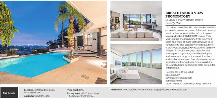 The Details Location: 960 Stradella Road, Los Angeles 90077 Asking price: $8,195,000 Year built: 1962 Living area: 4,320 square feet, 4 bedrooms, 6 bathrooms BREATHTAKING VIEW PROMONTORY Sotheby’s International Realty, Beverly Hills Features: + 18,000 square feet of interior living space; 960StradellaRd.com In prime Lower Bel Air, this view estate sited on nearly two acres is one of the best development or fixer opportunities in Los Angeles surrounded by $30M-$295M homes. This Mid-Century modern home features grand scale and walls of glass that showcase unobstructed city and canyon views from almost every room. Designed by celebrated architect William R. Stephenson, this architectural masterpiece is privately sited behind gates and features a large motor court, four beds and six baths, an open floorplan featuring an incredible indoor-outdoor flow, a sparkling pool, and a large, contiguous patio perfect for entertaining. Neyshia Go & Craig White 310.882.8357 neyshia@neyshiago.com neyshiago.com DRE#: Neyshia: 01933923; Craig: 1884948 See also