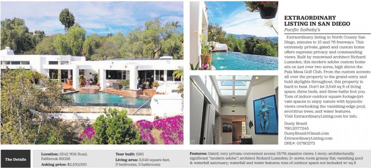The Details Location: 2542 Wilt Road, Fallbrook 92028 Asking price: $2,100,000 Year built: 1991 Living area: 3,549 square feet, 3 bedrooms, 3 bathrooms EXTRAORDINARY LISTING IN SAN DIEGO Pacific Sotheby’s Extraordinary listing in North County San Diego, minutes to 15 and 76 freeways. This extremely private, gated and custom home offers supreme privacy and commanding views. Built by renowned architect Richard Lumsden, this modern adobe custom home sits on just over two acres, high above the Pala Mesa Golf Club. From the custom accents all over the property to the grand entry and bold skylights throughout, this property is hard to beat. Don’t let 3,549 sq ft of living space, three beds, and three baths fool you. Tons of indoor-outdoor square footage/private spaces to enjoy nature with hypnotic views overlooking the vanishing-edge pool, avo/citrus trees, and water features. Visit ExtraordinaryListing.com for info. Dusty Brazil 760.207.7245 DustyBrazil@Gmail.com ExtraordinaryListing.com DRE#: 01780273 Features: Gated; very private; convenient access 15/76; massive views; 1 story; architecturally significant “modern adobe”; architect Richard Lumsden; 2+ acres; room granny flat; vanishing pool & waterfall sanctuary; waterfall and water features; tons of outdoor space not included w/ sq ft See also