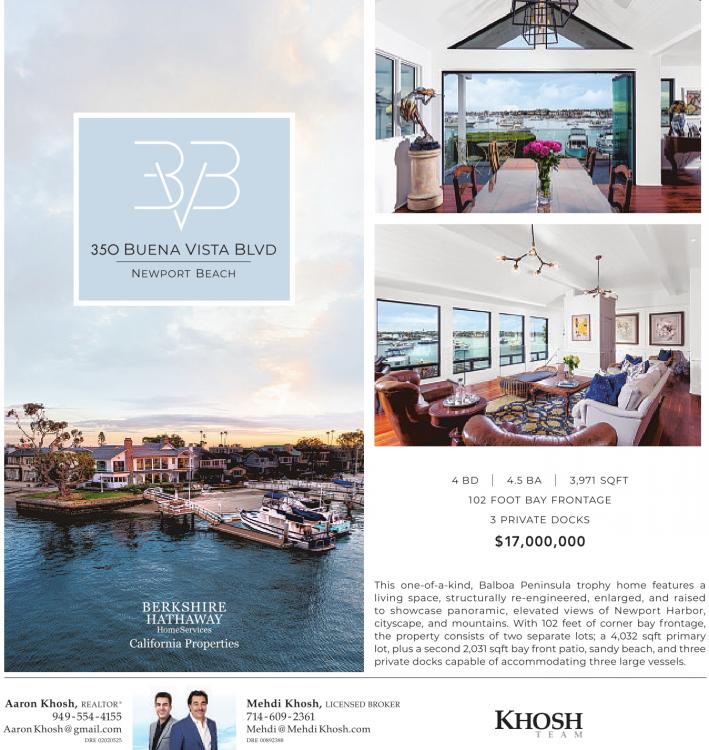 35O BUENA VISTA BLVD NEWPORT BEACH 4 BD | 4.5 BA | 3,971 SQFT 102 FOOT BAY FRONTAGE 3 PRIVATE DOCKS $17,000,000 This one-of-a-kind, Balboa Peninsula trophy home features a living space, structurally re-engineered, enlarged, and raised to showcase panoramic, elevated views of Newport Harbor, cityscape, and mountains. With 102 feet of corner bay frontage, the property consists of two separate lots; a 4,032 sqft primary lot, plus a second 2,031 sqft bay front patio, sandy beach, and three private docks capable of accommodating three large vessels. Aaron Khosh, REALTOR ® 949-554-4155 Aaron Khosh@gmail.com DRE 02020525 Mehdi Khosh, LICENSED BROKER 714-609-2361 Mehdi @Mehdi Khosh.com DRE 00892388