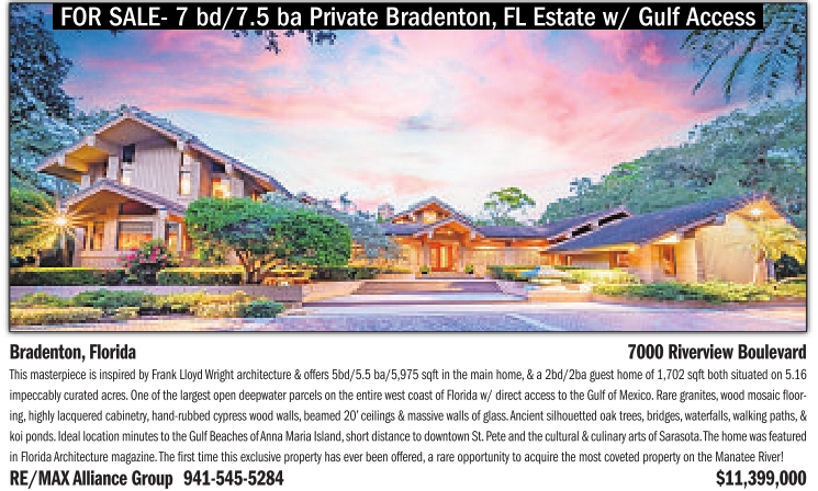 FOR SALE- 7 bd/7.5 ba Private Bradenton, FL Estate w/ Gulf Access Bradenton, Florida 7000 Riverview Boulevard This masterpiece is inspired by Frank Lloyd Wright architecture & offers 5bd/5.5 ba/5,975 sqft in the main home, & a 2bd/2ba guest home of 1,702 sqft both situated on 5.16 impeccably curated acres. One of the largest open deepwater parcels on the entire west coast of Florida w/ direct access to the Gulf of Mexico. Rare granites, wood mosaic flooring, highly lacquered cabinetry, hand-rubbed cypress wood walls, beamed 20’ ceilings & massive walls of glass.Ancient silhouetted oak trees, bridges, waterfalls, walking paths, & koi ponds.Ideal location minutes to the Gulf Beaches ofAnna Maria Island,short distance to downtown St.Pete and the cultural & culinary arts of Sarasota.The home was featured in Florida Architecture magazine.The first time this exclusive property has ever been offered, a rare opportunity to acquire the most coveted property on the Manatee River! RE/MAX Alliance Group 941-545-5284 $11,399,000