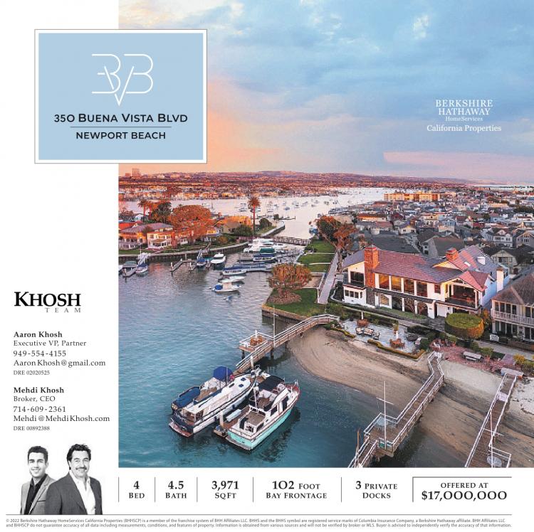 35O BUENA VISTA BLVD NEWPORT BEACH Aaron Khosh Executive VP, Partner 949 - 554 - 4155 Aaron Khosh @ gmail.com DRE 02020525 Mehdi Khosh Broker, CEO 714 - 609 - 2361 Mehdi @ Mehdi Khosh.com DRE 00892388 4 BED 4.5 BATH 3,971 SQ FT 1O2 FOOT BAY FRONTAGE 3 PRIVATE DOCKS OFFERED AT $17,OOO,OOO © 2022 Berkshire Hathaway HomeServices California Properties (BHHSCP) is a member of the franchise system of BHH Affiliates LLC. BHHS and the BHHS symbol are registered service marks of Columbia Insurance Company, a Berkshire Hathaway affiliate. BHH Affiliates LLC and BHHSCP do not guarantee accuracy of all data including measurements, conditions, and features of property. Information is obtained from various sources and will not be verified by broker or MLS. Buyer is advised to independently verify the accuracy of that information.