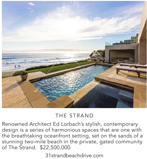THE STRAND Renowned Architect Ed Lorbach’s stylish, contemporary design is a series of harmonious spaces that are one with the breathtaking oceanfront setting, set on the sands of a stunning two-mile beach in the private, gated community of The Strand. $22,500,000 31strandbeachdrive.com