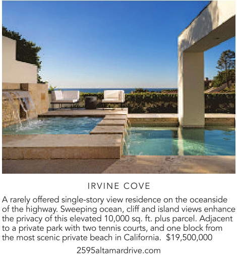 IRVINE COVE A rarely offered single-story view residence on the oceanside of the highway. Sweeping ocean, cliff and island views enhance the privacy of this elevated 10,000 sq. ft. plus parcel. Adjacent to a private park with two tennis courts, and one block from the most scenic private beach in California. $19,500,000 2595altamardrive.com