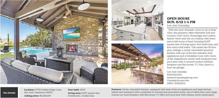 With the most dramatic views in all of Hunt Club, this property offers Marbella Golf and Country Club views, Stoneridge and Ladera Ranch views and sits on a hilltop with threeand-a-half acres of land, boasting 6,037 square feet of living space, five bedrooms, and four-and-a-half baths. This estate has 20-footplus ceilings, a newly remodeled gourmet kitchen with top-of-the-line stainless steel appliances and a breakfast room with views of the magnificent, newly built backyard and pool area with a covered outdoor kitchen, fireplace and flat-screen TV. Plus, there’s a four-car garage.