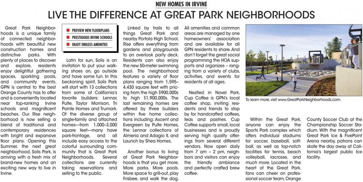 Great Park Neighborhoods is a unique family of connected neighborhoods with beautiful new construction homes and distinctive parks. With plenty of places to discover and explore, residents enjoy delightful gathering spaces, sparkling pools, and community events. GPN is central to the best Orange County has to offer and is conveniently located near top-ranking Irvine schools and magnificent beaches. Our Rise neighborhood is now selling a blend of traditional and contemporary residences with bright and expansive floor plans. Opening this Summer, the next great neighborhood, Solis Park, is arriving with a fresh mix of brand-new homes and an exciting new way to live in Irvine.