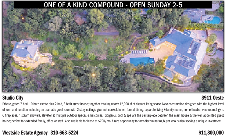 ONE OF A KIND COMPOUND - OPEN SUNDAY 2-5 Studio City 3911 Oeste Private, gated 7 bed, 10 bath estate plus 2 bed, 3 bath guest house; together totaling nearly 12,000 sf of elegant living space. New construction designed with the highest level of form and function including an dramatic great room with 2 story ceilings,gourmet cooks kitchen,formal dining,separate living & family rooms,home theatre,wine room & gym. 6 fireplaces, 4 steam showers, elevator, & multiple outdoor spaces & balconies. Gorgeous pool & spa are the centerpiece between the main house & the well appointed guest house; perfect for extended family, office or staff. Also available for lease at $79K/mo.A rare opportunity for any discriminating buyer who is also seeking a unique investment. Westside Estate Agency 310-663-5224 $11,800,000