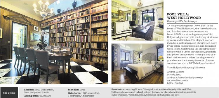 A Hollywood Regency “Jewel Box” in the heart of West Hollywood, this three-bedroom and four-bathroom new-construction home @2021 is a stunning example of old Hollywood glamour with the luxury of all-new systems and finishes. The elegant interior includes a walnut-paneled library, step-down living salon, Italian porcelain, and reclaimed wood floors. Celebrating the indoor/outdoor lifestyle with a Greek key lap pool, greenery, and potted orange trees, it’s truly a one-of-akind residence that offers the elegance of a grand estate, the turnkey features of newer construction, and a 93 Walk-Score location!