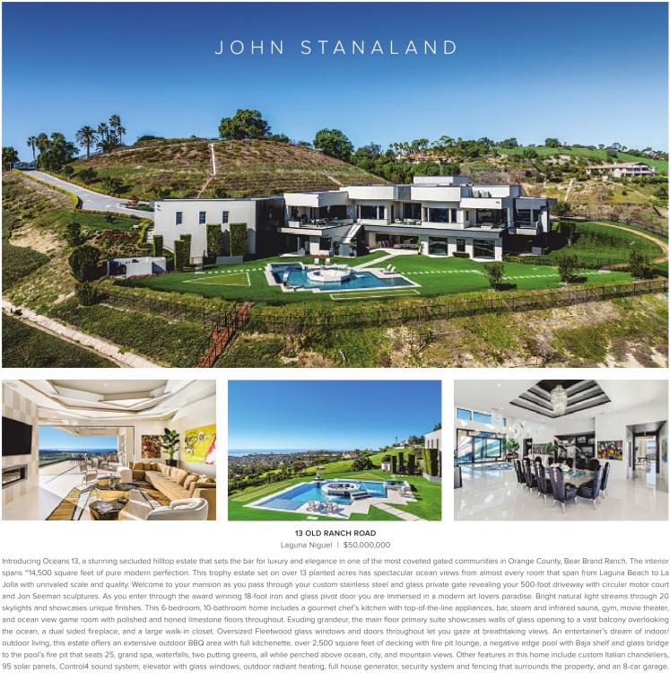 J O H N S T A N A L A N D 13 OLD RANCH ROAD Laguna Niguel | $50,000,000 Introducing Oceans 13, a stunning secluded hilltop estate that sets the bar for luxury and elegance in one of the most coveted gated communities in Orange County, Bear Brand Ranch. The interior spans ~14,500 square feet of pure modern perfection. This trophy estate set on over 13 planted acres has spectacular ocean views from almost every room that span from Laguna Beach to La Jolla with unrivaled scale and quality. Welcome to your mansion as you pass through your custom stainless steel and glass private gate revealing your 500-foot driveway with circular motor court and Jon Seeman sculptures. As you enter through the award winning 18-foot iron and glass pivot door you are immersed in a modern art lovers paradise. Bright natural light streams through 20 skylights and showcases unique finishes. This 6-bedroom, 10-bathroom home includes a gourmet chef’s kitchen with top-of-the-line appliances, bar, steam and infrared sauna, gym, movie theater, and ocean view game room with polished and honed limestone floors throughout. Exuding grandeur, the main floor primary suite showcases walls of glass opening to a vast balcony overlooking the ocean, a dual sided fireplace, and a large walk-in closet. Oversized Fleetwood glass windows and doors throughout let you gaze at breathtaking views. An entertainer’s dream of indoor/ outdoor living, this estate offers an extensive outdoor BBQ area with full kitchenette, over 2,500 square feet of decking with fire pit lounge, a negative edge pool with Baja shelf and glass bridge to the pool’s fire pit that seats 25, grand spa, waterfalls, two putting greens, all while perched above ocean, city, and mountain views. Other features in this home include custom Italian chandeliers, 95 solar panels, Control4 sound system, elevator with glass windows, outdoor radiant heating, full house generator, security system and fencing that surrounds the property, and an 8-car garage.