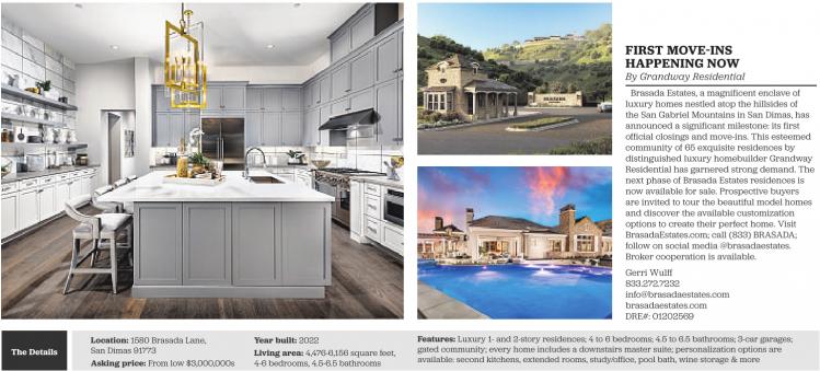 The Details Location: 1580 Brasada Lane, San Dimas 91773 Asking price: From low $3,000,000s Year built: 2022 Living area: 4,476-6,156 square feet, 4-6 bedrooms, 4.5-6.5 bathrooms FIRST MOVE-INS HAPPENING NOW By Grandway Residential Brasada Estates, a magnificent enclave of luxury homes nestled atop the hillsides of the San Gabriel Mountains in San Dimas, has announced a significant milestone: its first official closings and move-ins. This esteemed community of 65 exquisite residences by distinguished luxury homebuilder Grandway Residential has garnered strong demand. The next phase of Brasada Estates residences is now available for sale. Prospective buyers are invited to tour the beautiful model homes and discover the available customization options to create their perfect home. Visit BrasadaEstates.com; call (833) BRASADA; follow on social media @brasadaestates. Broker cooperation is available. Gerri Wulff 833.272.7232 info@brasadaestates.com brasadaestates.com DRE#: 01202569 Features: Luxury 1- and 2-story residences; 4 to 6 bedrooms; 4.5 to 6.5 bathrooms; 3-car garages; gated community; every home includes a downstairs master suite; personalization options are available: second kitchens, extended rooms, study/office, pool bath, wine storage & more See also