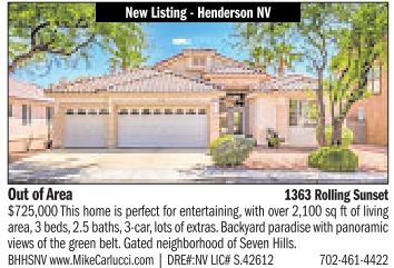 New Listing - Henderson NV Out of Area 1363 Rolling Sunset $725,000 This home is perfect for entertaining, with over 2,100 sq ft of living area,3 beds,2.5 baths,3-car,lots of extras.Backyard paradise with panoramic views of the green belt. Gated neighborhood of Seven Hills. BHHSNV www.MikeCarlucci.com | DRE#:NV LIC# S.42612 702-461-4422