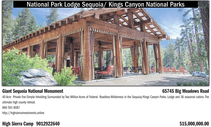 National Park Lodge Sequoia/ Kings Canyon National Parks Giant Sequoia National Monument 65745 Big Meadows Road 40 Acre Private Fee-Simple Inholding Surrounded by Two Million Acres of Federal Roadless Wilderness in the Sequoia/Kings Canyon Parks. Lodge and 36 seasonal cabins.The ultimate high county retreat. 866 591-8087 http://highsierrainvestments.online High Sierra Camp 9012922640 $15,000,000.00