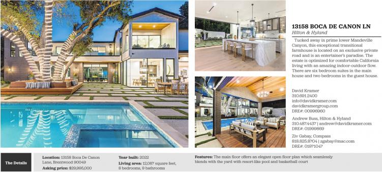 The Details Location: 13158 Boca De Canon Lane, Brentwood 90049 Asking price: $29,995,000 Year built: 2022 Living area: 12,087 square feet, 8 bedrooms, 9 bathrooms 13158 BOCA DE CANON LN Hilton & Hyland Tucked away in prime lower Mandeville Canyon, this exceptional transitional farmhouse is located on an exclusive private road and is an entertainer’s paradise. The estate is optimized for comfortable California living with an amazing indoor-outdoor flow. There are six bedroom suites in the main house and two bedrooms in the guest house. David Kramer 310.691.2400 info@davidkramer.com davidkramergroup.com DRE#: 00996960 Andrew Buss, Hilton & Hyland 310.487.4437 | andrew@davidkramer.com DRE#: 01999869 Ziv Gabay, Compass 818.825.8704 | zgabay@mac.com DRE#: 01971047 Features: The main floor offers an elegant open floor plan which seamlessly blends with the yard with resort-like pool and basketball court See also