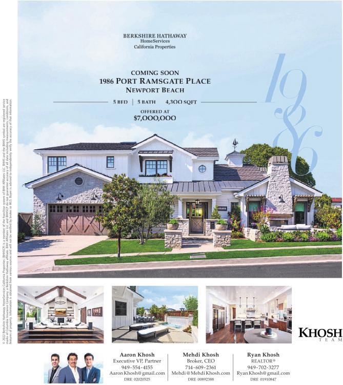 COMING SOON 1986 PORT RAMSGATE PLACE NEWPORT BEACH 5 BED | 5 BATH | 4,3OO SQFT OFFERED AT $7,OOO,OOO Aaron Khosh Executive VP, Partner 949 - 554 - 4155 Aaron Khosh@ gmail.com DRE 02020525 Mehdi Khosh Broker, CEO 714 - 609 - 2361 Mehdi @ Mehdi Khosh.com DRE 00892388 Ryan Khosh REALTOR ® 949 - 702- 3277 Ryan Khosh@ gmail.com DRE 01910847