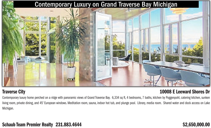 Traverse City Contemporary Luxury on Grand Traverse Bay Michigan 10008 E Leeward Shores Dr Contemporary luxury home perched on a ridge with panoramic views of Grand Traverse Bay. 6,334 sq ft, 4 bedrooms, 7 baths, kitchen by Poggenpohl, catering kitchen, sunken living room, private dining, and 45’ European windows. Meditation room, sauna, indoor hot tub, and plunge pool. Library, media room. Shared water and dock access on Lake Michigan. Schaub Team Premier Realty 231.883.4644 $2,650,000.00