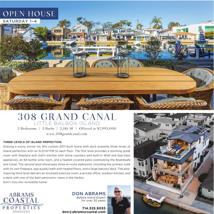 O P E N H O U S E SATURDAY 1–4 3 0 8 G R A N D C A N A L LITTLE BALBOA ISLAND 3 Bedrooms | 5 Baths | 2,181 SF | Offered at $7,995,000 www.308grandcanal.com THREE LEVELS OF ISLAND PERFECTION. Gracing a sunny corner lot, this custom 2017-built home with dock presents three levels of Island perfection with an ELEVATOR to each floor. The first level provides a stunning great room with fireplace and chef’s kitchen with stone counters and built-in Wolf and Sub-Zero appliances, an 84-bottle wine room, and a heated covered patio overlooking the Boardwalk and Canal. The second level showcases three en-suite bedrooms, including the primary suite with its own fireplace, spa-quality bath with heated floors, and a large balcony deck. The aweinspiring third level delivers an enclosed exercise room, a private office, outdoor kitchen, and a deck with one of the best panoramic views in the Harbor. Don’t miss this incredible home! DON ABRAMS Balboa Island Expert for over 20 years DRE#0123423 714.325.9055 don@abramscoastal.com