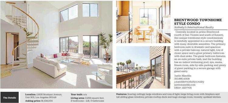 The Details Location: 11628 Montana Avenue, Unit 305, Los Angeles 90049 Asking price: $1,199,000 Year built: n/a Living area: 2,258 square feet, 2 bedrooms + loft, 3 bathrooms BRENTWOOD TOWNHOME STYLE CONDO Sotheby’s International Realty Centrally located in prime Brentwood (north of San Vicente and south of Sunset), this unique townhome-style condominium is tastefully appointed in a secure building with many desirable amenities. The primary bedroom suite is dramatic and spacious with a private balcony, natural light, lots of closet space and a great primary bathroom with dual sinks. The guest bedroom features an en-suite private bath, and the building has an indoor swimming pool, spa, sauna, fitness room, side-by-side parking and plenty of guest parking in a secure garage with gated entry. Justin Mandile 310.860.4509 j.mandile@sothebys.realty justinmandile.com DRE#: 1507705 Features: Soaring ceilings; large windows and tons of light; large living room with fireplace and tall sliding glass windows; private rooftop deck and huge storage room; recently updated kitchen See also